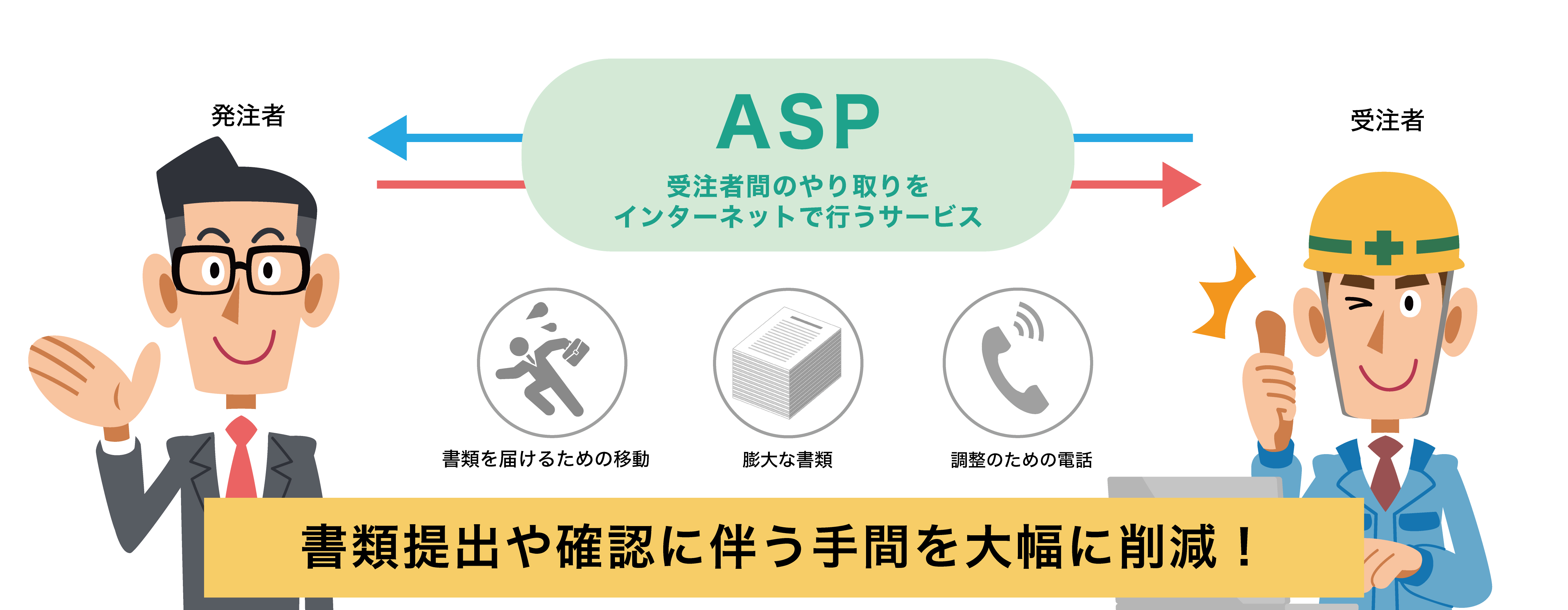 情報共有システム(ASP: Application Service Provider)とは、これまで紙や電話、メールで行っていた受発注者間の情報のやり取りを、インターネット上で行うためのクラウドシステムです。